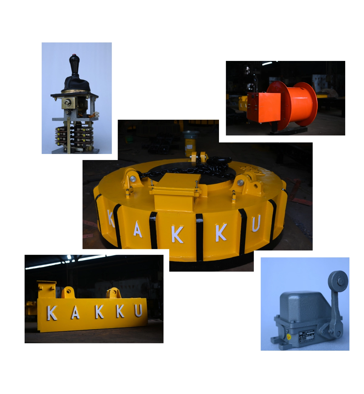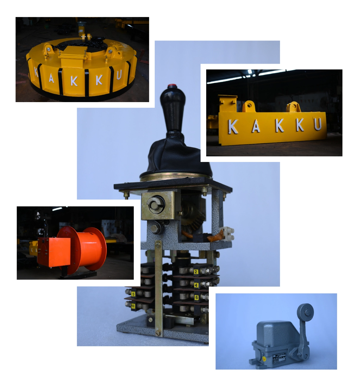 Steadily but surely, the “KAKKU” tag made its presence felt in major Industries and its Product range which began with Electrical Relays, forayed into Control & Selector Switches, Conveyor Safety Switches , Master Controllers, Limit Switches, AC & DC Electro Magnetic Brakes, Lifting Electromagnets, Resistance Boxes, Crane Cabins, Armchair Control Desk and for various type of Cranes. Besides Cranes, Commander Controllers required for Blast Furnace and Rolling Mill applications for Steel Plants were also added to the product range. The complete Product range is reflected in the Company Brochure.